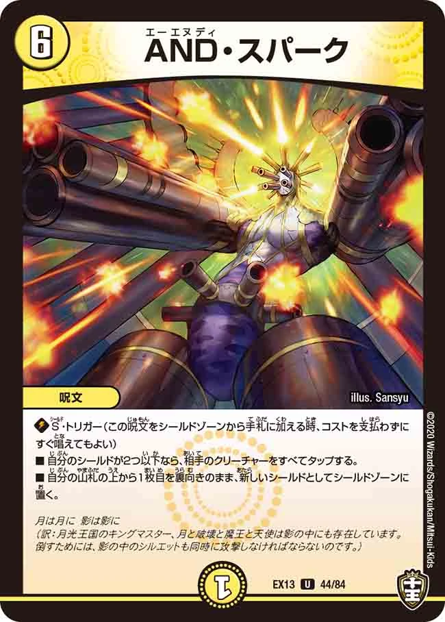 ■ 自分のシールドが2つ以下なら、相手のクリーチャーをすべてタップする。 ■ 自分の山札の上から1枚目を裏向きのまま、新しいシールドとして自分のシールドゾーンに置く。 |