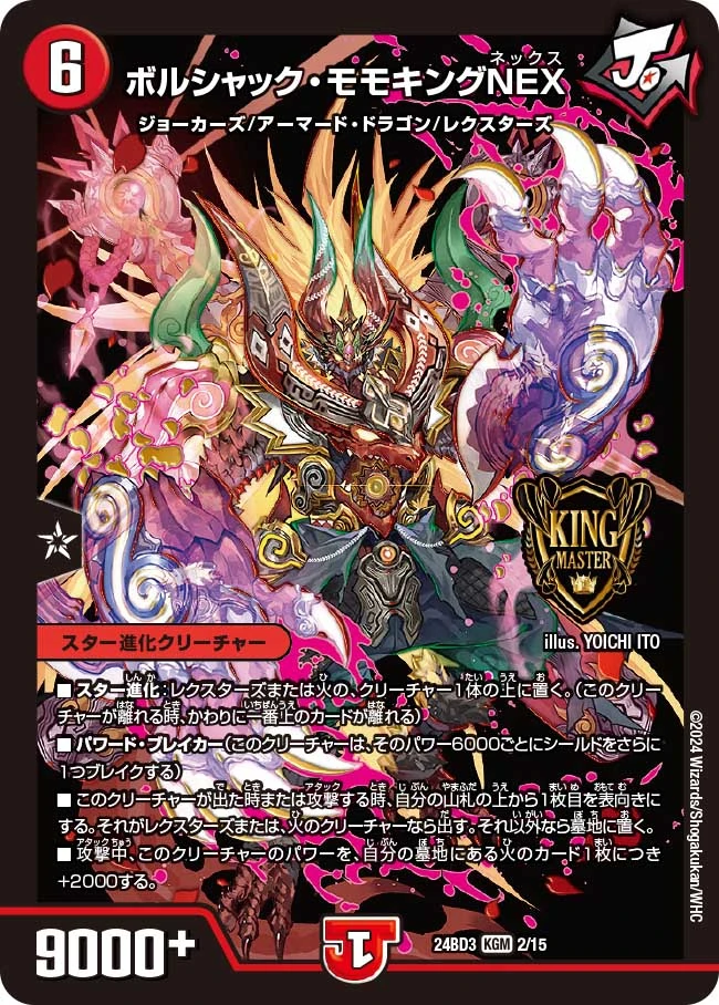 KM1/KM3, 1S/20, 1B/20 — King Master Card DMEX-19 Master Final Memorial Pack M㊙︎1/M㊙︎10 — King Master Card DM24-BD3 Dream Saga Deck: Book of Momoking 2/15 — King Master Card DM25-RP1 Jashin Versus Jashin: ~Soul of the Abyss~ SP1/SP5 — King Master Card Promotional CP3a/Y20 — King Master Card | |