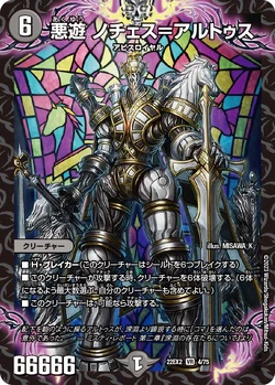 | ■ Hexa breaker (This creature breaks 6 shields.) ■ Whenever this creature attacks, destroy 6 creatures. (Choose a maximum of 6, including your own creatures.) ■ This creature attacks if able. |