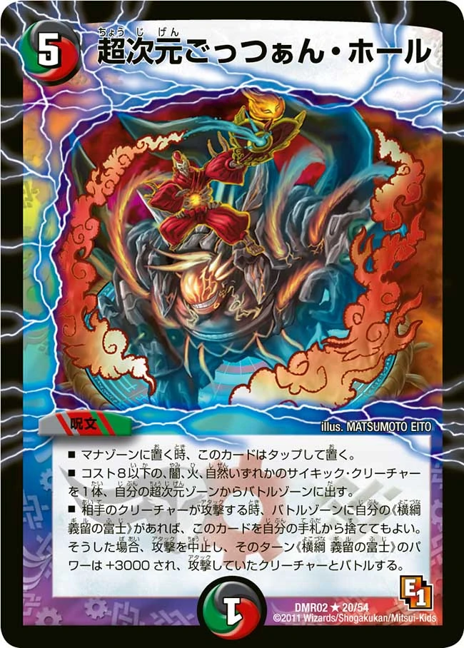 ■ (This spell is put into your mana zone tapped.) ■ Put a Darkness, Fire, or Nature psychic creature that costs 8 or less from your hyperspatial zone into the battle zone. ■ Whenever an opponent's creature attacks, if you have a Gil Fuji, Yokozuna in the battle zone, you may discard this card. If you do, stop the attack, that turn your Gil Fuji, Yokozuna gets +3000 power, and it battles with the attacking creature. |