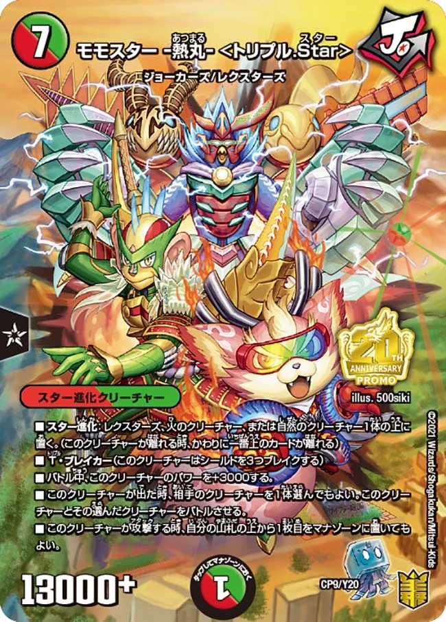 ■ Star Evolution—Put on one of your RexStars, fire or nature creatures. (When this creature would leave, the top card leaves instead.) ■ Triple breaker (This creature breaks 3 shields.) ■ While battling, this creature gets +3000 power. ■ When you put this creature, you may choose one of your opponent's creatures. This creature and that chosen creature battle. ■ Whenever this creature attacks, you may put the top card of your deck into your mana zone |