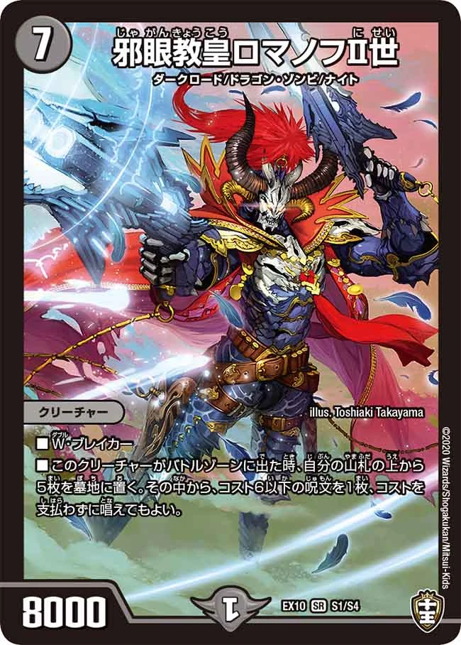 | Flavor Texts: | ロマノフの血統は終わらぬ。煉獄でよみがえれ、ロマノフI世よ! "The bloodline of Romanov will never end. Rise from Purgatory, Romanov the 1st!" ─Romanov the 2nd, Demonic Eye Hierophant (DMD-25) 邪眼の一族は、争いを求める。The Demonic Eye clan seeks conflict. (DMRP-19) |