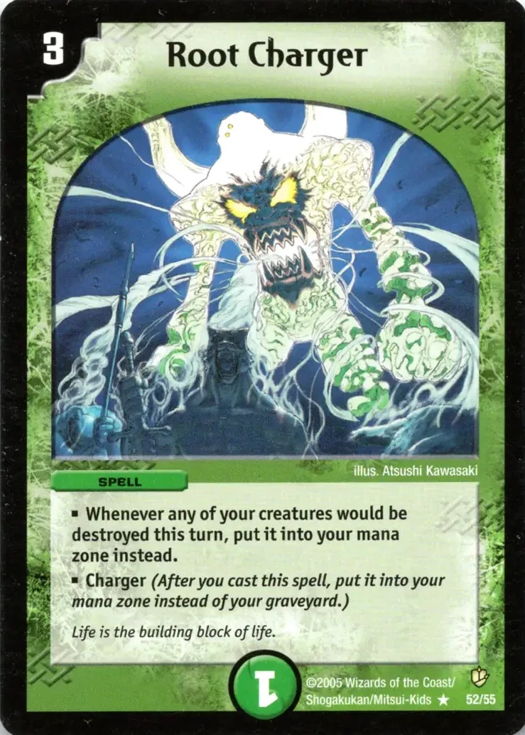 ■ このターン、自分のクリーチャーがバトルゾーンから自分の墓地に置かれるとき、墓地に置くかわりに自分のマナゾーンに置く。 ■ チャージャー(この呪文を唱えた後、墓地に置くかわりにマナゾーンに置く) |