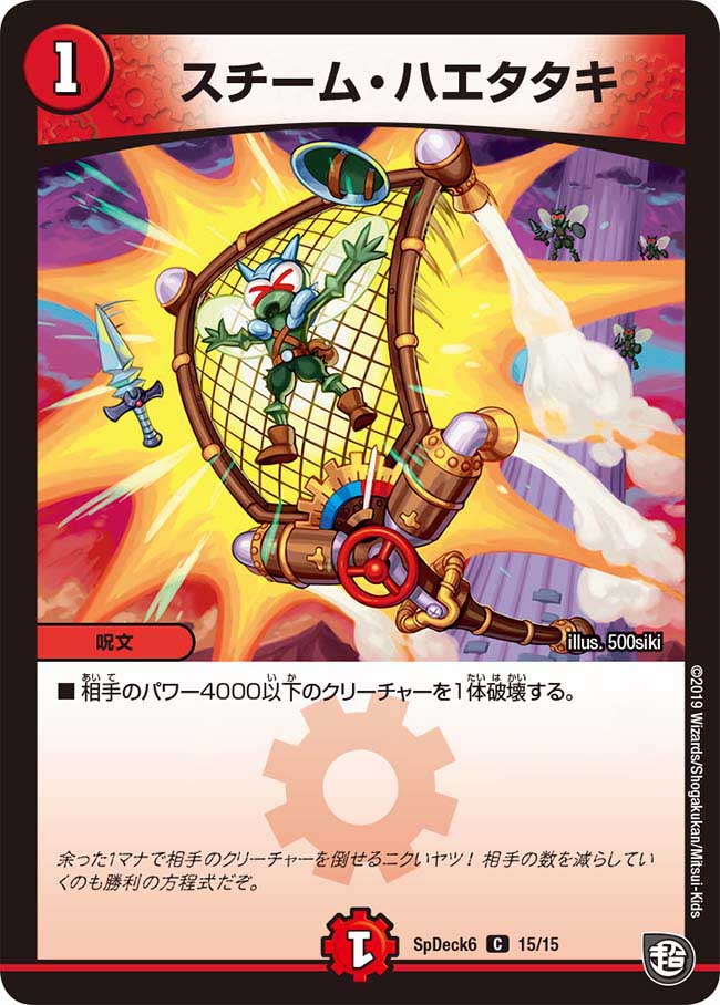 | Flavor Texts: | どんな敵でも蒸気の力でバチーンと一撃! もちろん、この網に入る大きさの敵ならね! Any enemy can be taken down with a single blow using the power of steam! Of course, that’s only if the enemy fits within the size of this net! (DMRP-02) 余った1マナで相手のクリーチャーを倒せるニクいヤツ! 相手の数を減らしていくのも勝利の方程式だぞ。"No matter the enemy, one blow with the power of steam! Of course, as long as they fit within this net!" (SpDeck6) マジでボンバーな力、見せてやるぜ! "I'll show you some seriously explosive power!" —Bolts & Dachicco Churis (P75/Y19) |