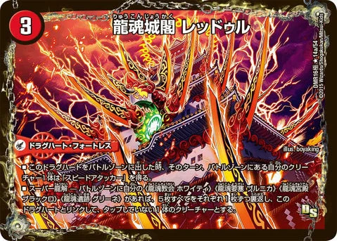 | ■ When you put this fortress into the battle zone, one of your creatures gets "speed attacker" until the end of the turn. ■ Super Dragsolution—If you have Whitey, Dragon Soul Church, Bluenika, Dragon Soul Fortress, Blacko, Dragon Soul Palace, Reddull, Dragon Soul Castle and Greene, Dragon Soul Ruins in the battle zone, flip each card one by one to the dragheart creature side untapped. |