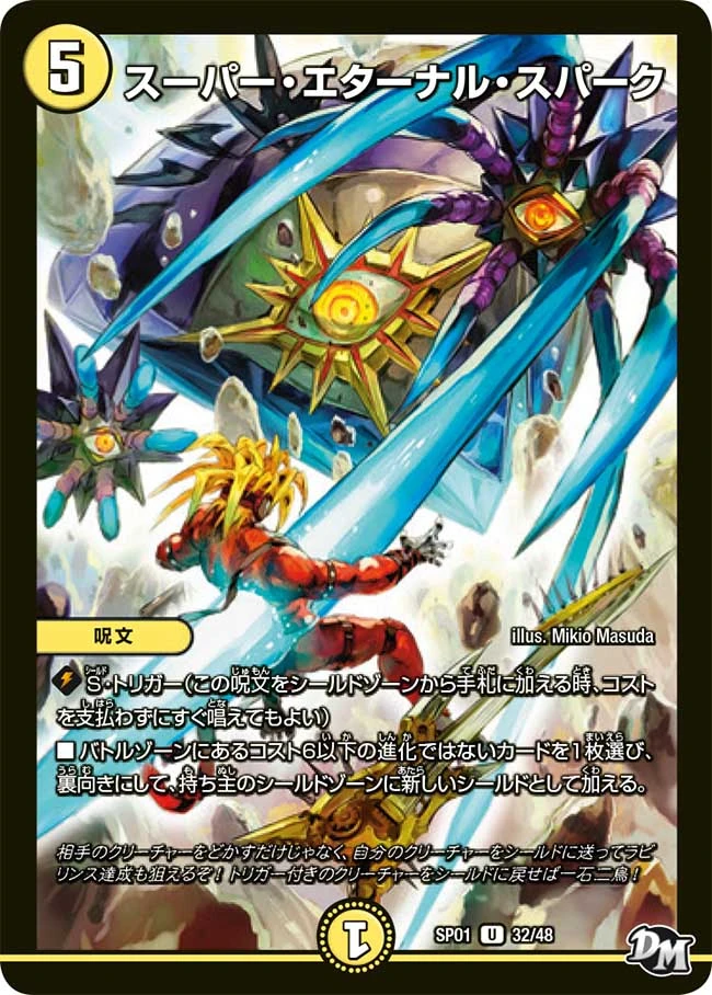 | Flavor Texts: | 知識も魂もなくとも、正義があれば、封印はできる。 Even without knowledge and soul, as long as there's Justice, we can seal it. (DMR-15) 相手のクリーチャーをどかすだけじゃなく、自分のクリーチャーをシールドに送ってラビリンス達成も狙えるぞ! トリガー付きのクリーチャーをシールドに戻せば一石二鳥! "Not only can you move your opponent's creatures, but you can also put your own creatures into your shields to aim for a Labyrinth achievement! If you return a creature with a trigger to the shield, it's killing two birds with one stone!" (DMSP-01) |