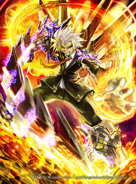 However, in the background story, he was originally an Oracle creature who betrayed them because he wasn't satisfied with the Oracle's strict rules and stagnant behavior, as well as Zorro Star's cruel antics, so he became an Outrage against them. He was friends with Crossfire, Millionaire and Alice, Codebreaker and opposed the outrages, and even became an Exile Creature himself. He also saved Bruce, Dead or Alive from Ultra Knight Punk, Shentury and this had Bruce revive Crossfire as gratitude. However, when "Mastermind" awakened, he was killed instantly along with Crossfire and Alice.